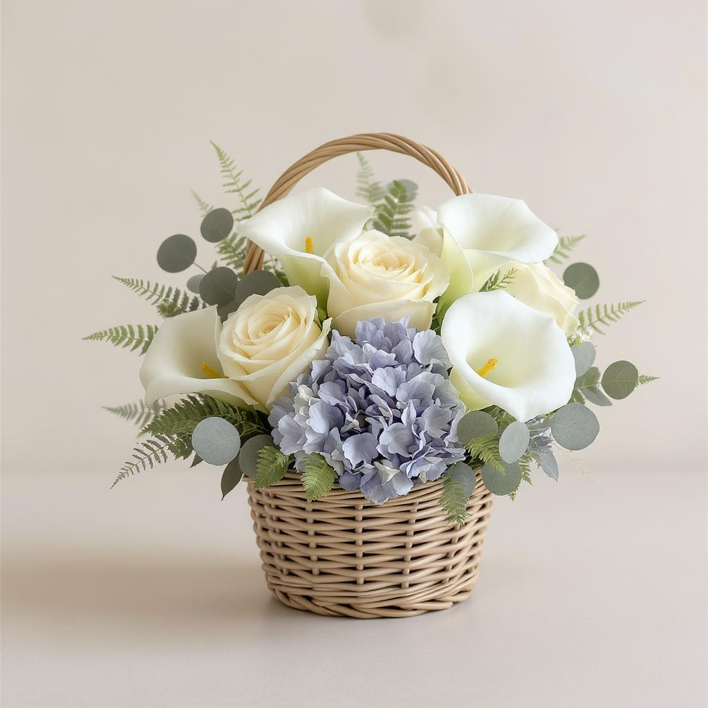 A floral tribute to sincere hearts and steady hands. This gracefully balanced basket features soft ivory roses, sky blue hydrangeas, and pure white calla lilies—each bloom chosen to symbolize dependable love and quiet devotion. Eucalyptus and fern greens offer a grounded touch of calm, wrapping the message in elegance.