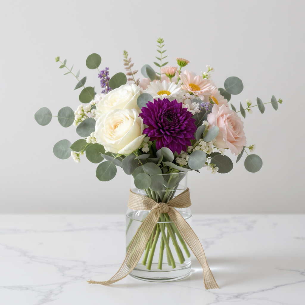 - 🌸 Includes: ivory roses, purple chrysanthemums, pink gerberas, daisies, lavender, eucalyptus