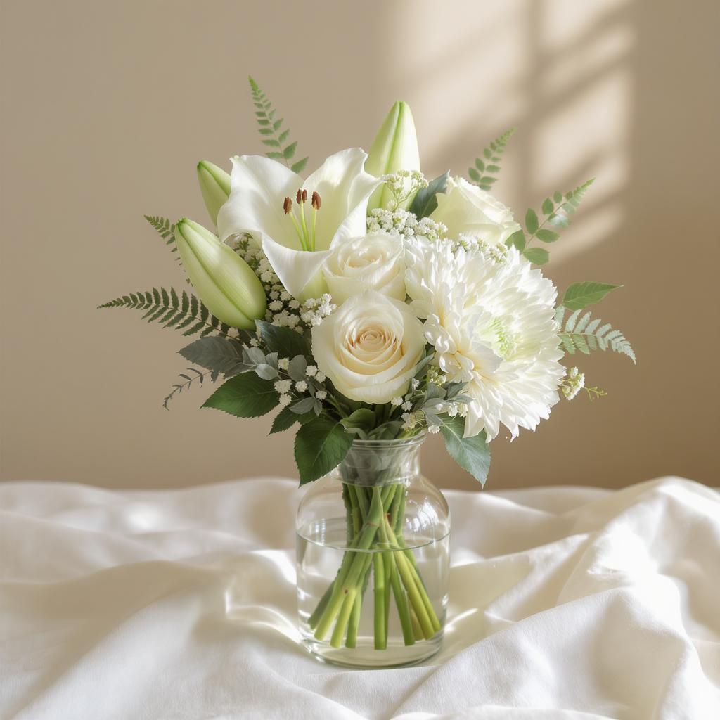 A graceful tribute of purity and peace, Serenity Grace features elegant white lilies, soft ivory roses, and full white chrysanthemums, thoughtfully arranged in a clear glass vase. Each bloom symbolizes comfort, honor, and remembrance—making this bouquet a perfect expression of sympathy or spiritual peace.